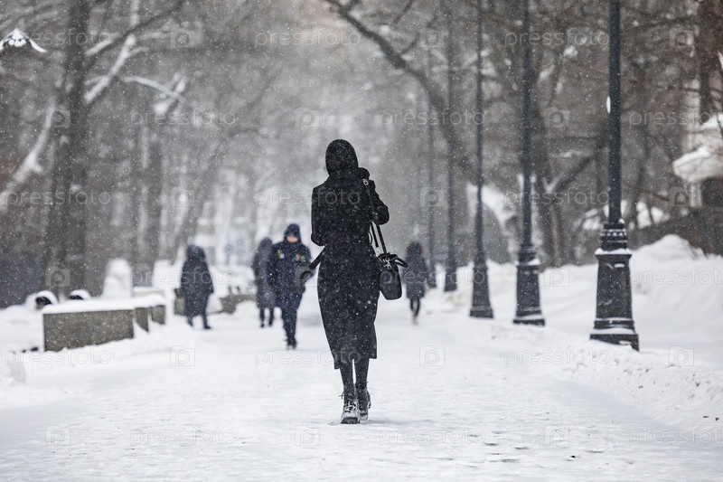 Пешеходы идут по заснеженной городской улице во время снегопада