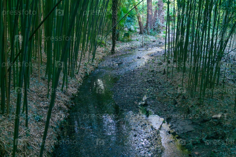 Неглубокая река в тенистом бамбуковом лесу