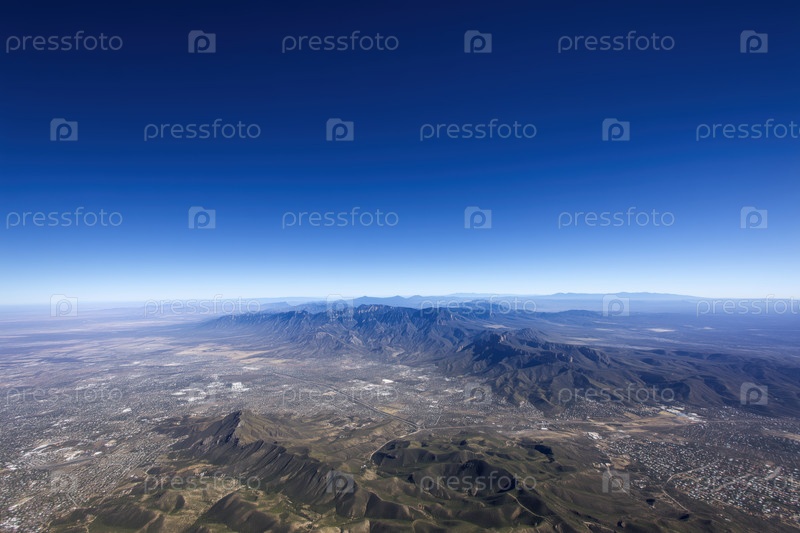 Вид с воздуха горной местности и долины с голубым небом