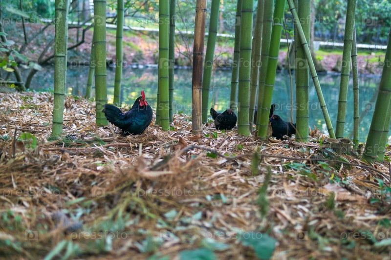 Цыплят среди бамбука на берегу пруда