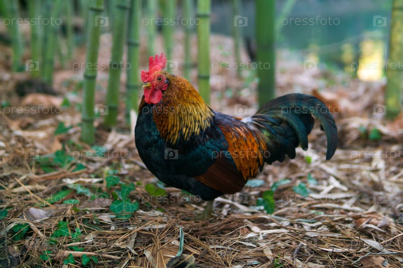 Петух в саду на бамбуковом фоне