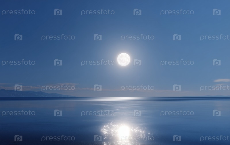 Полнолуние над морем ночью с отражением в воде, горы видны на дальнем берегу