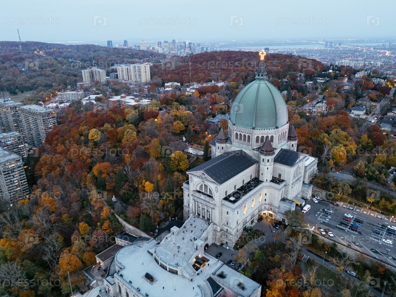 Вид с воздуха на Ораторий Святого Иосифа в Монреале осенью с цветными деревьями и горизонтом города при закате