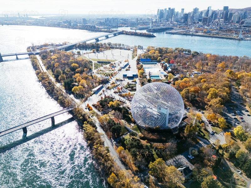 Вид из воздуха Монреаля с биосферой и осенним пейзажем над речными островами