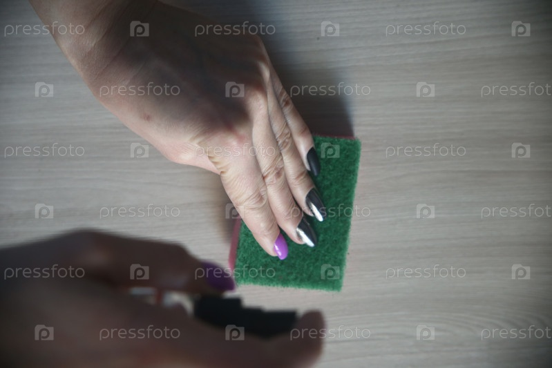 Поролоновая губка для уборки и чистящее средство в женских руках. Уборка квартиры и клининг