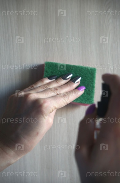 Поролоновая губка для уборки и чистящее средство в женских руках. Уборка квартиры и клининг