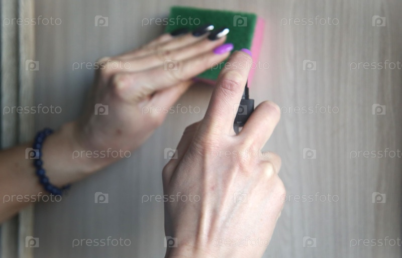 Поролоновая губка для уборки и чистящее средство в женских руках. Делать уборку. Уборка квартиры и клининг