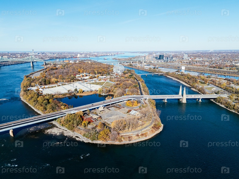 Вид из воздуха Монреаля с биосферой и осенним пейзажем над речными островами