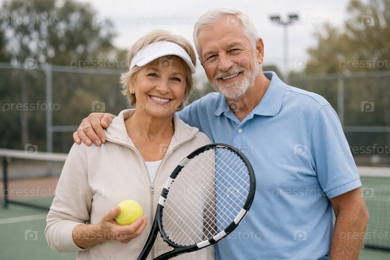 Пожилая пара на теннисном корте: активные пенсионеры в спортивной одежде с ракеткой и мячом, совместная тренировка и здоровый образ жизни на открытом воздухе