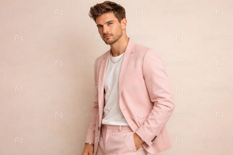 Мужской модный образ: модель в пастельно-розовом костюме и белой футболке на однотонном светлом фоне — студийный минимализм, деловой кэжуал с аксессуарами (цепочка, браслет)