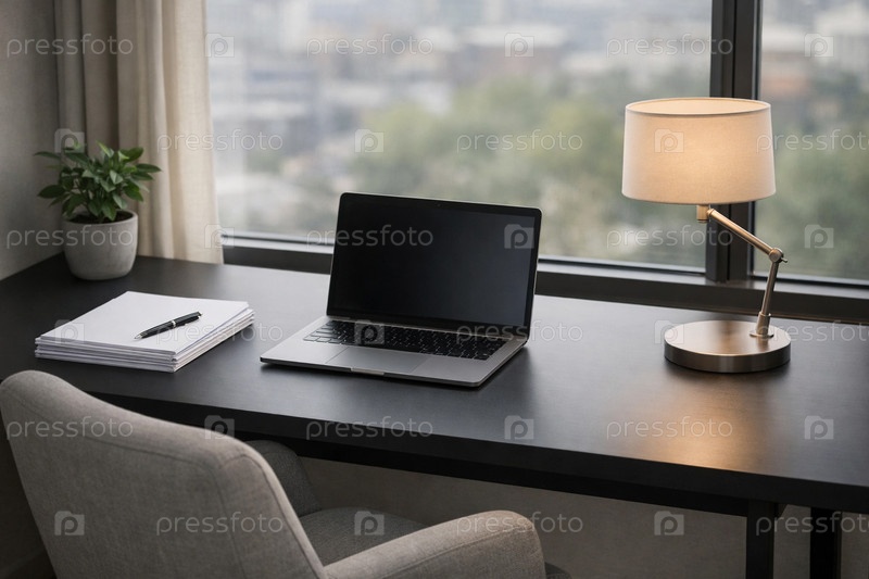 Современный домашний рабочий стол у окна с открытым ноутбуком, настольной лампой, стопкой документов и растением — минималистичный уютный офисный уголок для работы и продуктивности