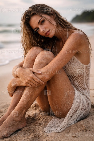 Женщина в прозрачном сетчатом платье сидит, обхватив колени, на песчаном пляже: мокрые волосы, покрытая песком кожа и теплая летняя атмосфера в золотой час на фоне моря
