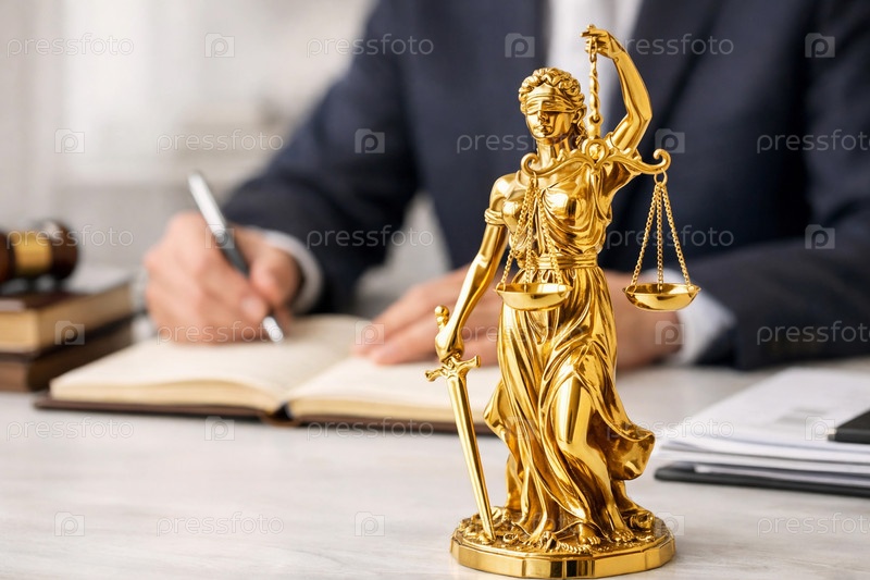 Статуэтка Фемиды в золоте на переднем плане рабочего стола юриста: весы и меч как символы правосудия, на заднем плане адвокат в деловом костюме подписывает документы, судебный молоток и правовые книги в офисной обстановке — концептуальная фотография юриди