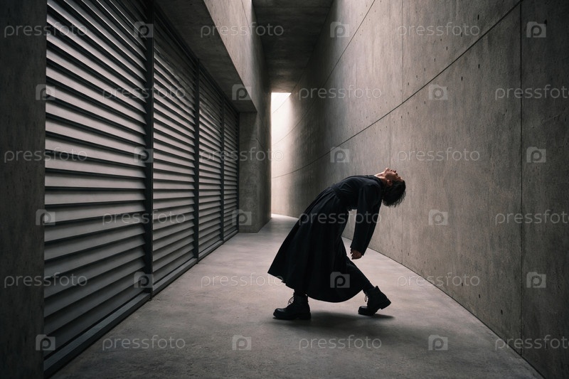 Драматичный кадр: современная модель в черном пальто в танцевальной позе, изгиб тела и экспрессия на фоне минималистичного бетонного коридора с металлическими жалюзи