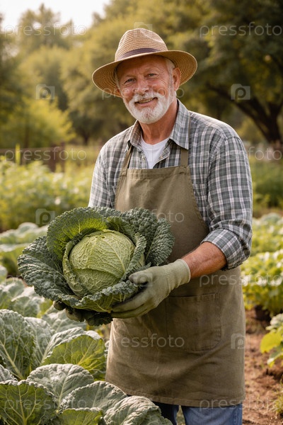Фермер в соломенной шляпе держит крупный кочан капусты в руках на органическом огороде — свежий урожай и традиционное устойчивое сельское хозяйство
