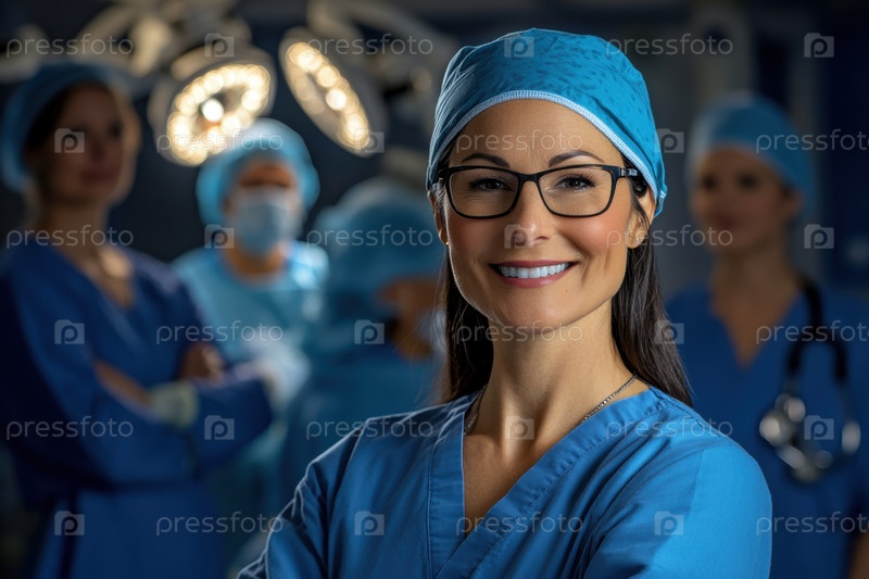Решительная женщина-хирург в синих халатах стоит в операционной с ее медицинской командой на заднем плане под яркими хирургическими огнями