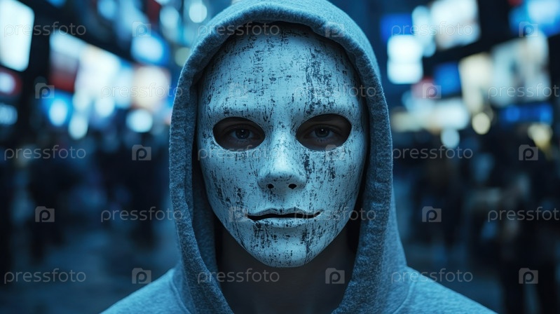 Таинственная фигура с капюшоном в маске черепа в цифровом мире