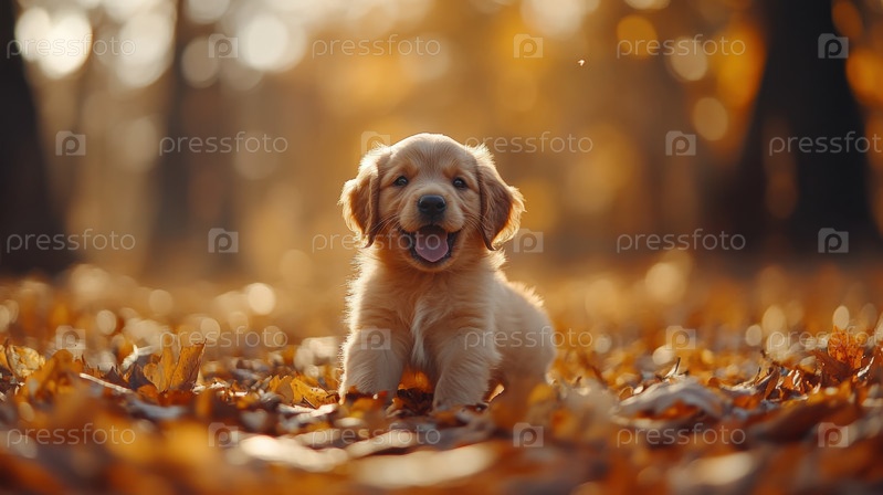 Щенок золотистого ретривера играет в осенние листья