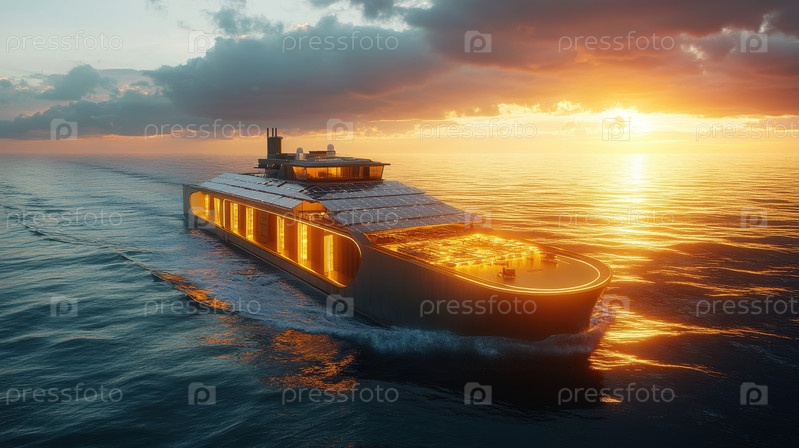 Экологически чистый баржа с солнечным питанием на закате