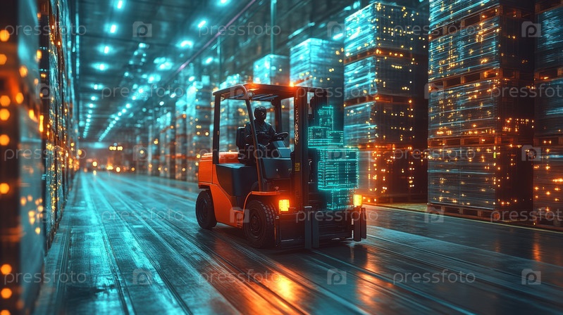 Футуристический вилочный погрузчик работает на высокотехнологичном складе