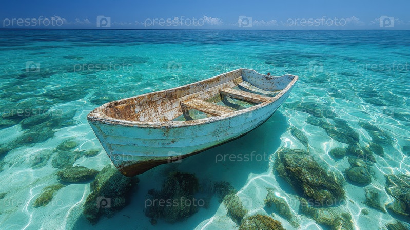 Старая деревянная лодка плавает в кристально чистой тропической воде