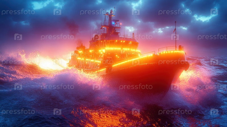 Ярко освещенная спасательная лодка движется по темным океанским волнам на закате, создавая драматический контраст теплых и прохладных цветов