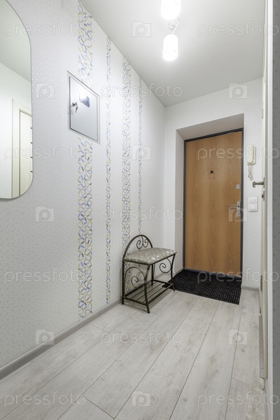Вид на яркий подъезд с легкой деревянной входной дверью и металлической скамейкой с узорочной подушкой.Пространство украшено обоями вертикальных узоров, зеркалом и серыми ламинированными полами