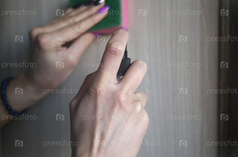 Поролоновая губка для уборки и чистящее средство в женских руках. Делать уборку. Уборка квартиры и клининг