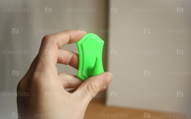 Зеленый крючок для полотенец. Рука держит кухонный крючок крупным планом. Концепция обустройства квартиры и быта