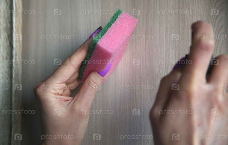 Поролоновая губка для уборки и чистящее средство в женских руках. Человек протирает пыль. Уборка квартиры и клининг