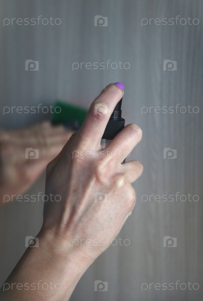 Поролоновая губка для уборки и чистящее средство в женских руках. Уборка квартиры и клининг
