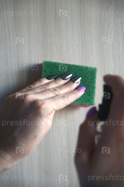 Поролоновая губка для уборки и чистящее средство в женских руках. Уборка квартиры и клининг