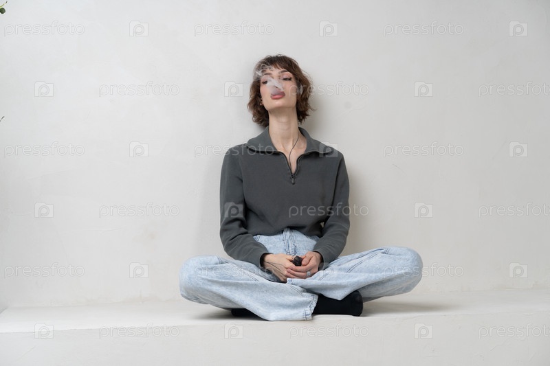 Портрет молодой красивой женщины в студии, сидящей на стуле