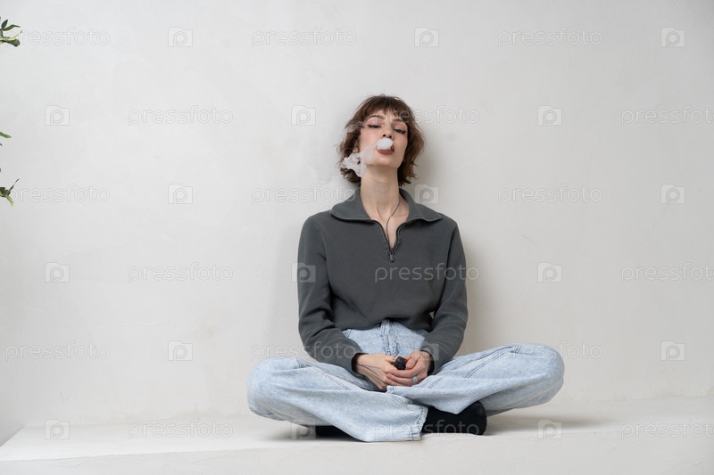 Портрет молодой красивой женщины в студии, сидящей на стуле