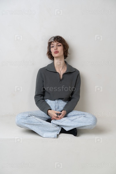 Портрет молодой красивой женщины в студии, сидящей на стуле