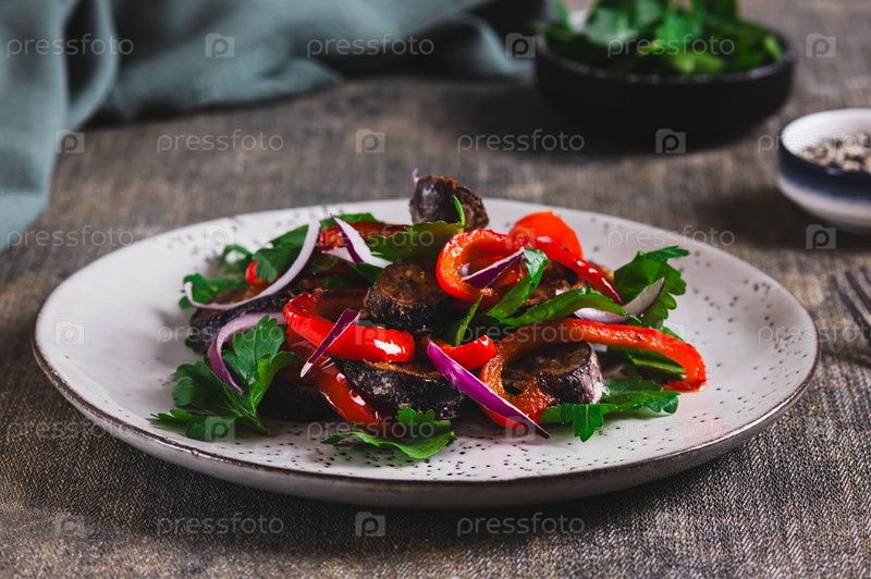 Теплый салат с жареным баклажаном, черным перцем, луком и травами на тарелке на столе