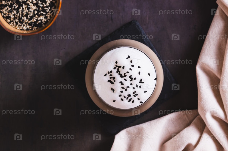 Близкий снимок гастрономического напитка с черным сусамовым латте в стакане на столе