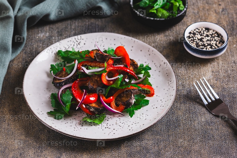 Вегетарианский салат из овощей с баклажанами, перцем и петрушкой на тарелке за столом
