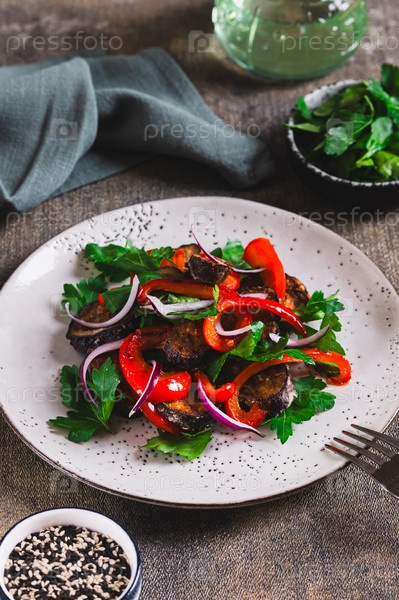 Вегетарианский овощный салат с баклажанами, перцем и петрушкой на тарелке вертикальный вид