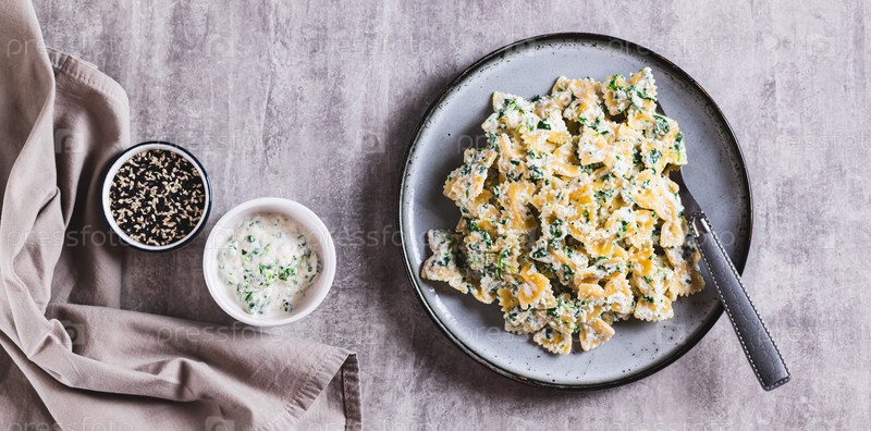 Макароны в кремовой рикоте и шпинатном соусе на тарелке на столе верхний вид веб-баннер