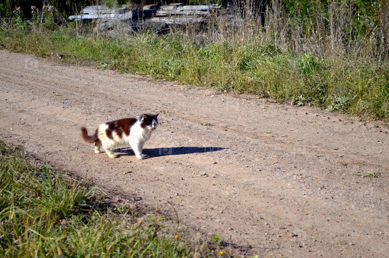 Уличная кошка на грунтовой дороге
