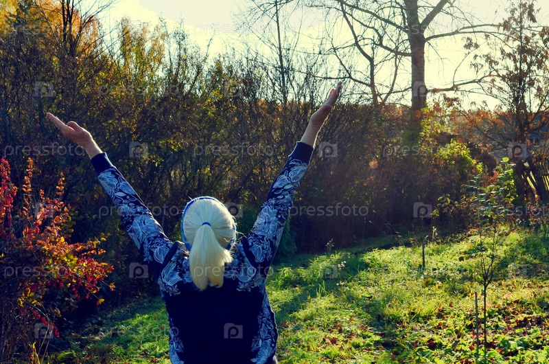 Пожилая женщина медитирует на природе. Тай-чи
