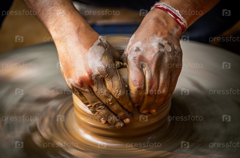 Умелые руки ремесленников формируют влажную глину на вращающемся гончарном колесе, создавая керамическую вазу в традиционной глинтарной мастерской