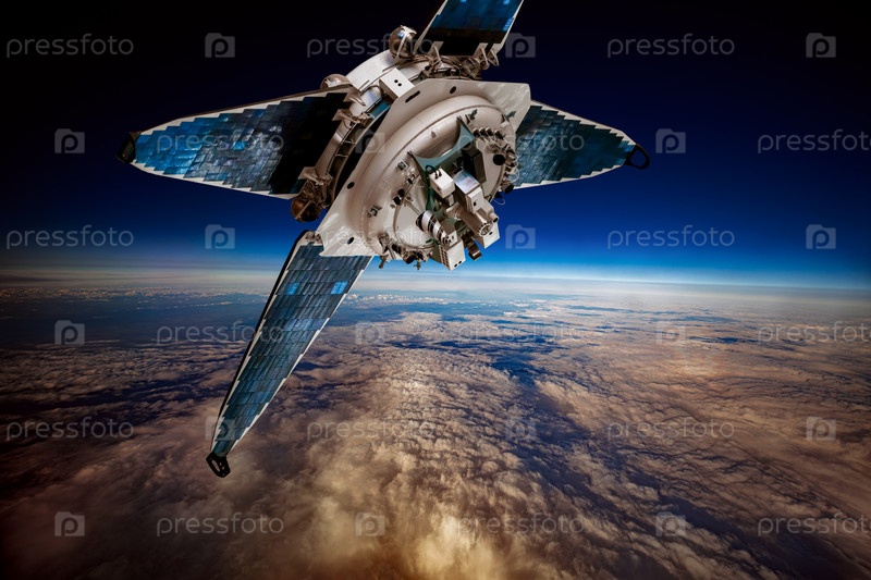 Детальный вид спутника в космосе с металлической структурой, антеннами и большими солнечными панелями на орбите над голубой атмосферой Земли и оранжевыми облаками против темной пустоты