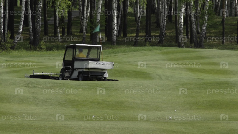 Автомобиль по техническому обслуживанию поля для гольф-гольфа работает на фэрвее, чтобы сохранить его в отличном состоянии