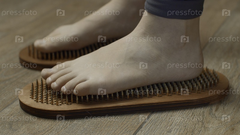Женская нога, стоящая на досках с гвоздями, вблизи. СМИ. Босоногая женщина, стоявшая на доске для ногтей йоги