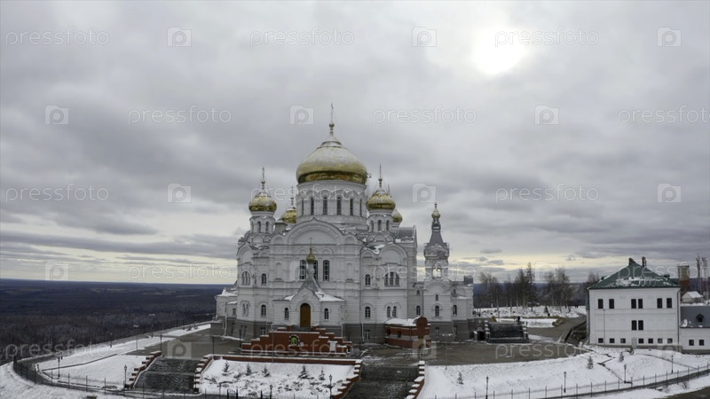Вид с воздуха белой церкви со золотыми куполами в холодный зимний день.Клип Концепция религии и архитектуры