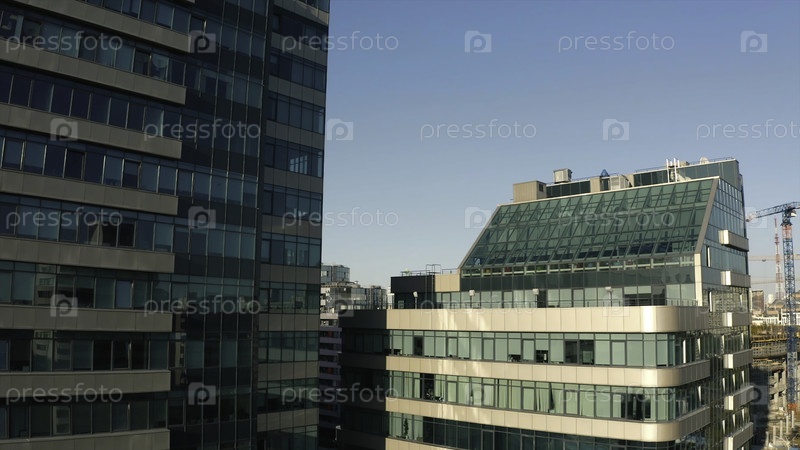 Вид сверху фасада красивых стеклянных небоскребов. Фрагмент кадров. Красивые стеклянные небоскребы в солнечный летний день. Прекрасная архитектура стеклянных небоскребов в центре современного города