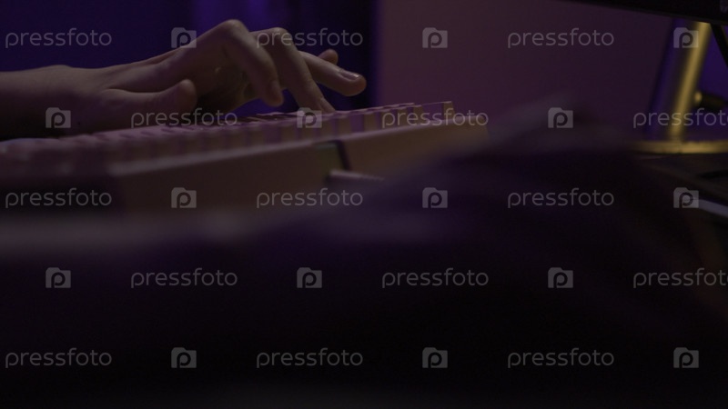 Близкий план человека, играющего в компьютерные игры. Фрагмент кадров. Рука перемещает мышь и нажимает клавиатуру во время компьютерной игры. Игрок движет мышкой и нажимает клавиатуру
