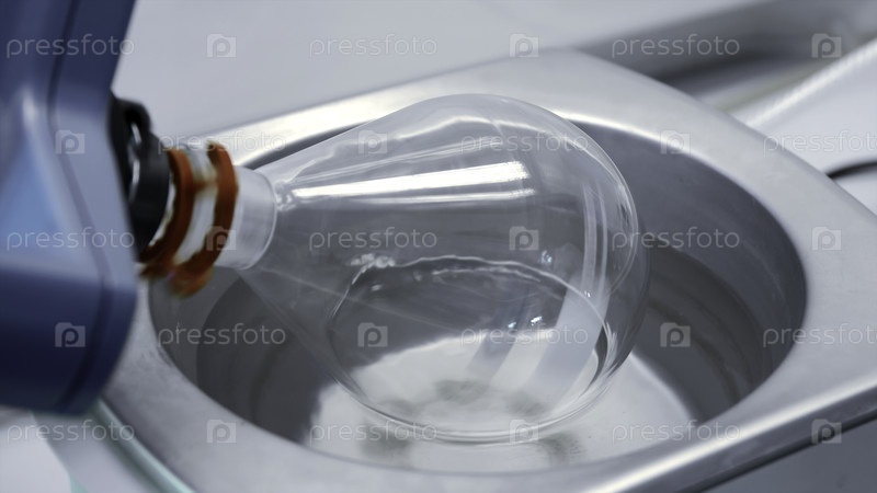 Ближайшее изображение вращающегося механизма чистой стеклянной колбы. Запасные кадры. Медицинское или химическое лабораторное оборудование